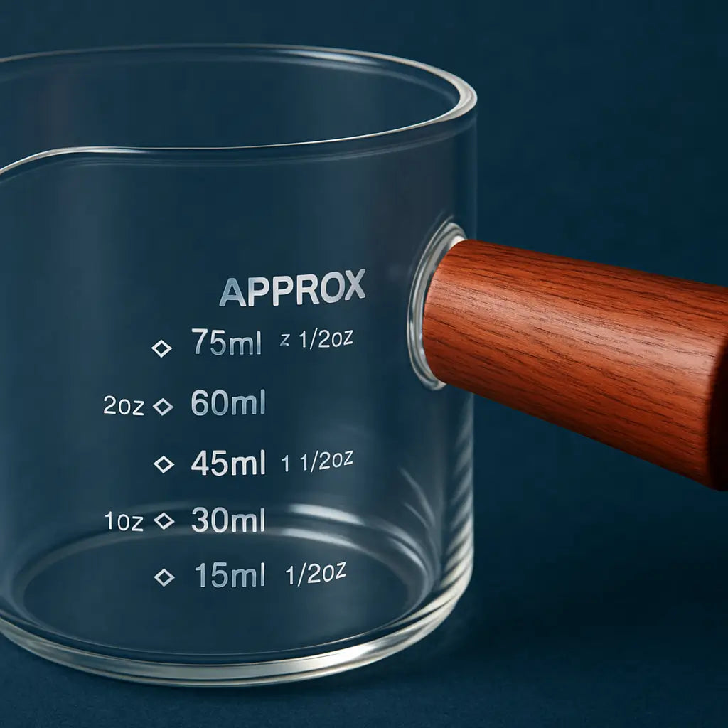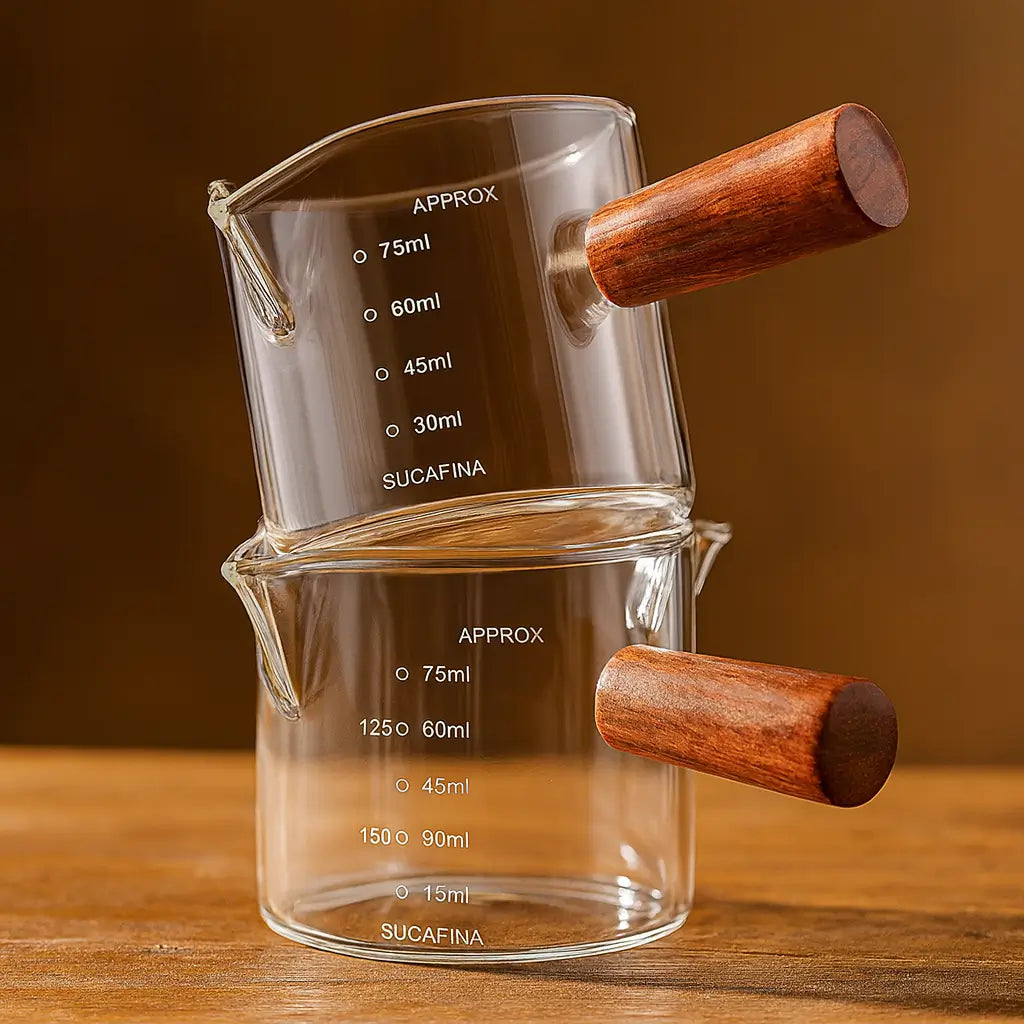 Copo Medidor de Vidro com Alça de Madeira Café Expresso – Precisão e conforto no preparo